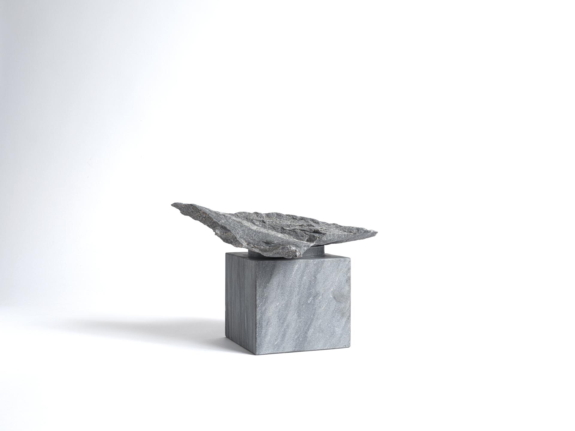 Erranti: pezzi non riproducibili. Normalmente li rispettiamo nella loro integrità, talvolta li trasformiamo il minimo necessario per collocarli in un ambiente abitativo. Trovanti: a volte la forma degli scarti presenta caratteristiche di continuità. Queste pietre ispirano forme riproducibili. Adam: sono pezzi fatti col fango, ottenuto con la polvere della lavorazione della pietra mischiata con acqua di montagna. Micare oscuro è un viaggio simbolico attraverso la materia, porcellana di Limoges + Eclisseo silver black.
